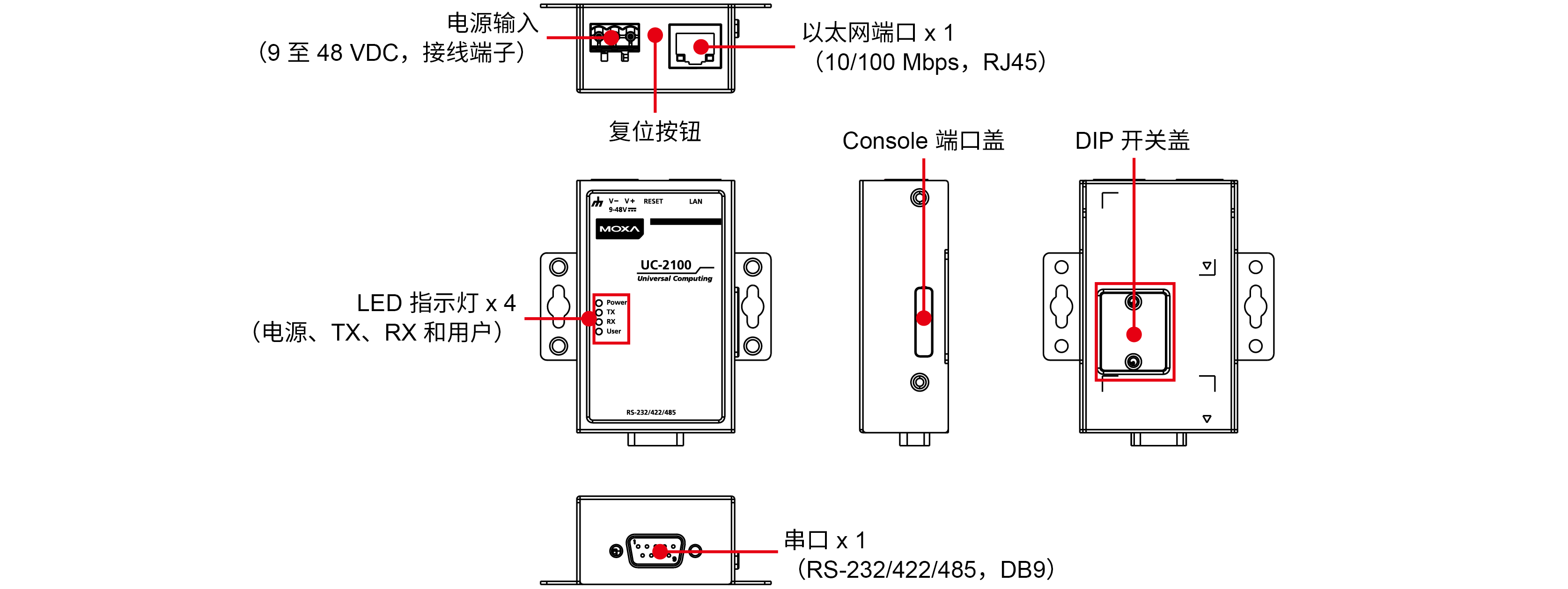 UC-2101-LX:RS-232/422/485 端口 x 1,軟件可選(DB9 公頭)
