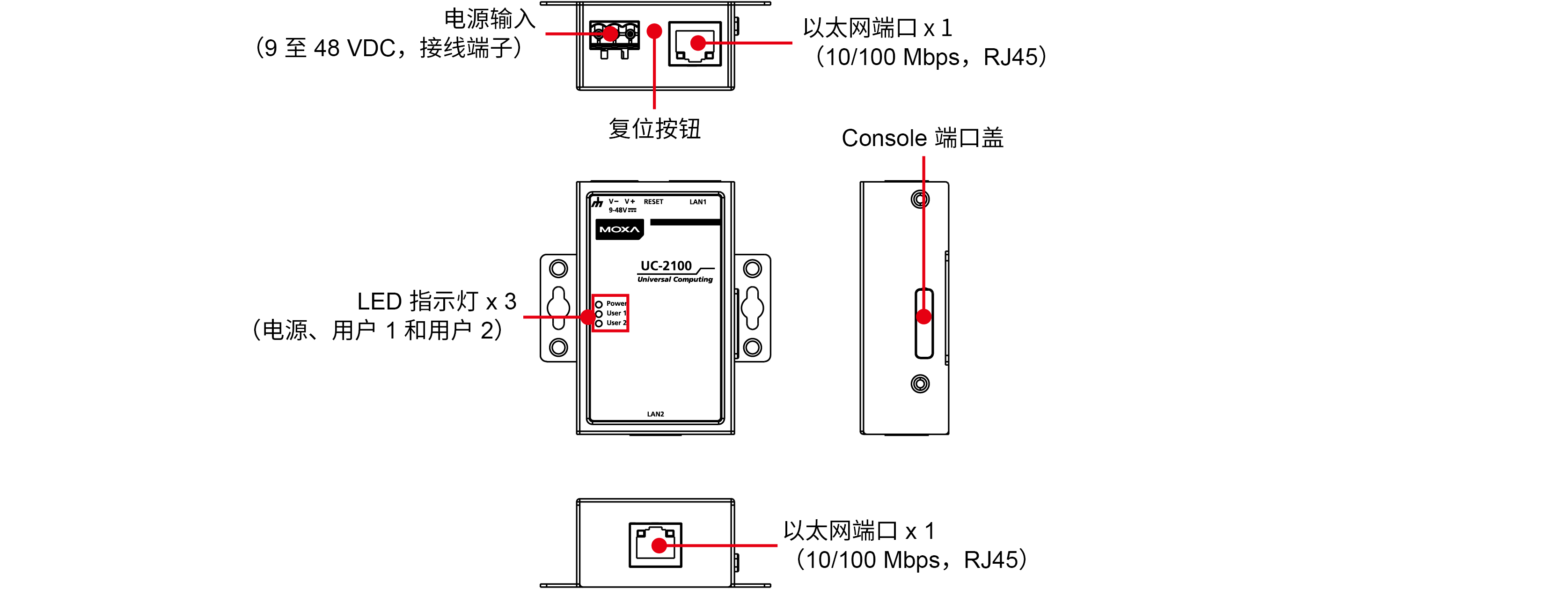 UC-2112-T-LX:自適應 10/100 Mbps 端口(RJ45 接頭)x 1,自適應 10/100/1000 Mbps 端口(RJ45 接頭)x 1
