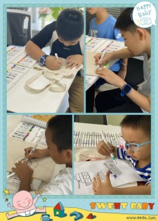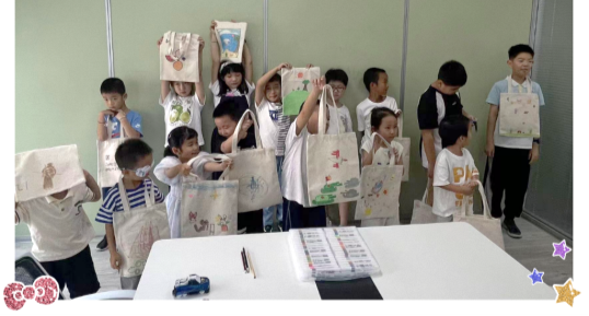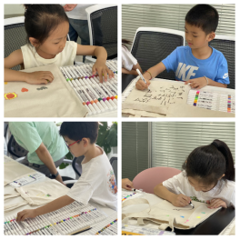 活動開始我們給每位小朋友分發(fā)了丙烯筆和布袋,小朋友們發(fā)揮自己的想象力把對開放日的快樂畫在布袋上。