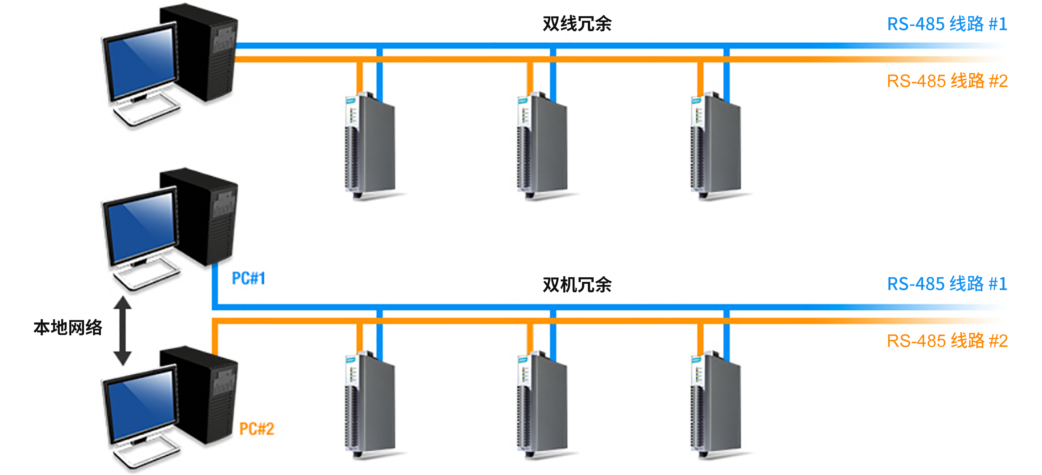 Moxa ioLogik R1200 系列提供 2 個 RS-485 端口,當(dāng)其中一個 RS-485 端口損壞時,可以快速切換到另一個 RS-485 端口,以便進行快速測試或維修。RS-485 遠程 I/O 設(shè)備是低成本技術(shù),然而 Moxa 的雙 RS-485 端口可節(jié)省更多成本。借助 ioLogik R1200,可使用雙 RS-485 端口設(shè)置接線、提供計算機冗余或使用兩種計算機拓?fù)鋫浞菥W(wǎng)絡(luò)。在冗余接線方面,當(dāng)計算機檢測到一個 RS-485 連接沒有響應(yīng)時,可以快速切換到另一條 RS-485 線路,從而確?,F(xiàn)場傳感器與中央計算機之間連續(xù)通信。此外,用戶還可以自定義設(shè)置。在計算機冗余方面,ioLogik R1200 可在系統(tǒng)宕機時為系統(tǒng)操作員提供安全備份。