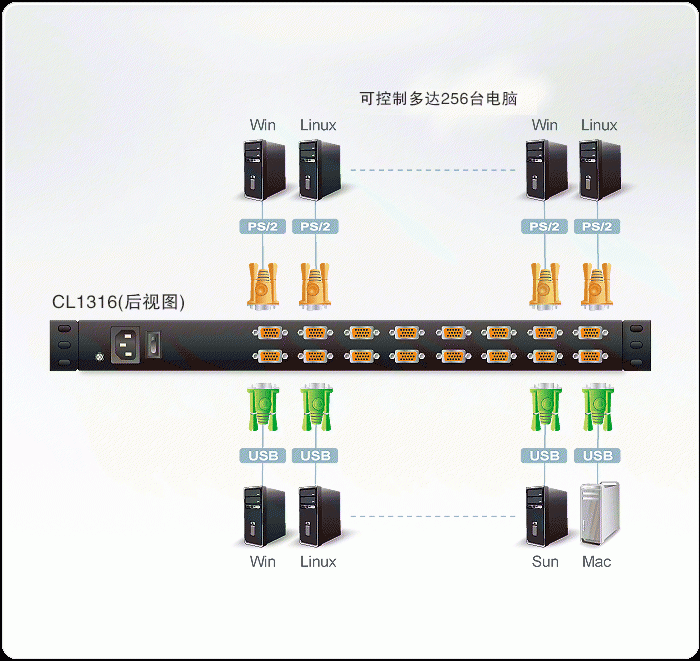 • 通過(guò)兩層占口級(jí)聯(lián)可連接多達(dá)16臺(tái)切換器,單一控制端可管理多達(dá)256臺(tái)電腦