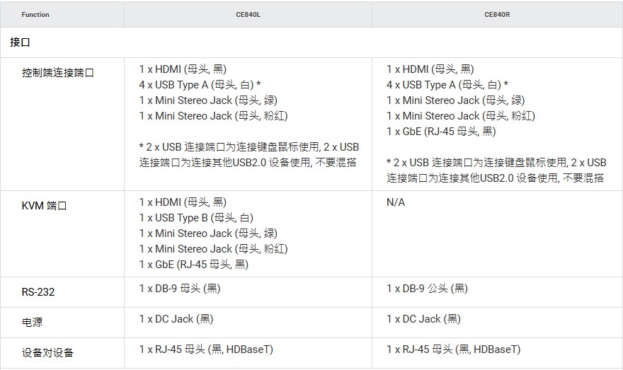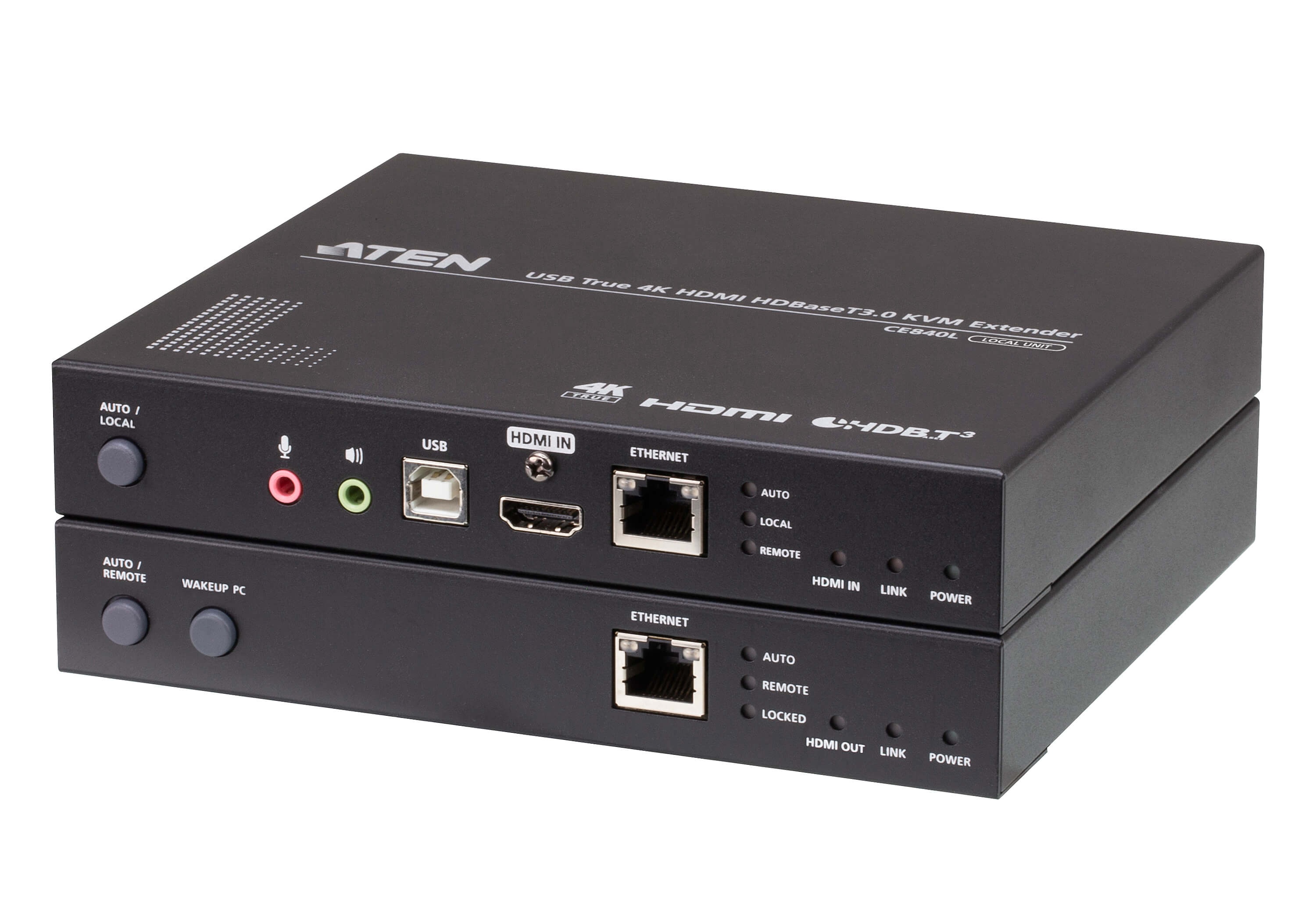 CE840采用HDBaseT 3.0技術,由一個近端和一個遠程組成,通過一條 Cat 6A或更高規(guī)格之線材 (建議使用ATEN 2L-2920 Cat 6A線材),即可支持無壓縮的True 4K HDMI、音頻、RS-232、以太網(wǎng)絡和USB信號傳輸長達100m。安裝簡潔、具經(jīng)濟效益,且維持高質量的內容傳輸。CE840支持雙控制端操作,近端與遠程各搭載兩個USB端口 (用于連接USB鍵盤和鼠標) 以及可切換兩端USB控制權的切換按鍵。前面板LED燈可顯示當前的USB控制模式。此外,兩端裝置各有一個HDMI輸出端口與另外兩個連接USB外圍設備的USB 2.0連接端口,因此,用戶在一個位置即可獲取雙端的信息,進而在遠處管理設備。