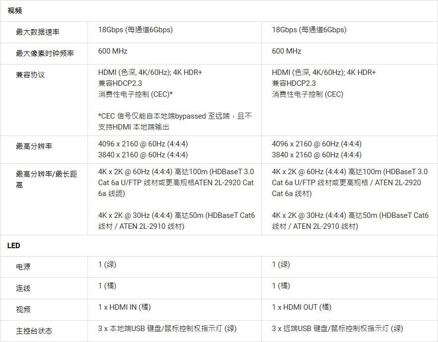 • HDBaseT 3.0 – 通過一條 Cat 6A或更高規(guī)格之線材 (建議使用ATEN 2L-2920 Cat 6A線材),即可支持無壓縮、零延遲的True 4K HDMI、音頻、RS-232、以太網(wǎng)絡和USB信號長距離傳輸