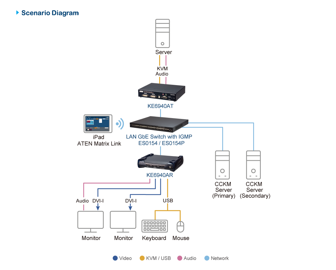 作為 IP架構(gòu)的矩陣信號延長器,KE6940A可支持各種不同方式的配置以滿足不同的工作環(huán)境,如單點(diǎn)對單點(diǎn)、單點(diǎn)對多點(diǎn)、多點(diǎn)對單點(diǎn),或與KE Matrix管理軟件 (CCKM) 結(jié)合,以多點(diǎn)對多點(diǎn)的配置方式整合為一個(gè) KVM over IP Matrix (矩陣模式) 系統(tǒng),讓用戶可針對不同的工作環(huán)境進(jìn)行彈性化的布線安裝。