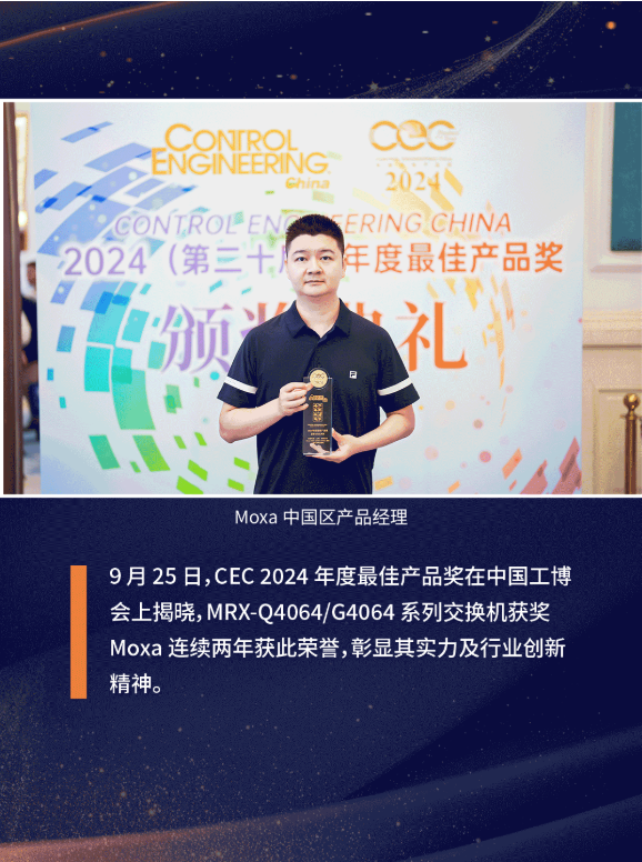 近日,MRX-Q4064/G4064 三層模塊化工業(yè)以太網(wǎng)交換機(jī)榮獲 “CEC 2024 年度最佳產(chǎn)品獎(jiǎng)”,連續(xù)多年獲此殊榮,彰顯了 Moxa 實(shí)力及對(duì)自動(dòng)化與制造業(yè)創(chuàng)新的貢獻(xiàn)。