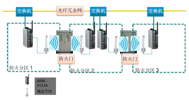 在每道防火門(mén)處安裝一臺(tái)AWK-3131A做為AP接入點(diǎn),每臺(tái)AWK-3131A上連接兩個(gè)定向天線,分別安裝于防火門(mén)的兩側(cè)來(lái)向管廊內(nèi)發(fā)射無(wú)線信號(hào),以保證巷道內(nèi)的無(wú)線信號(hào)覆蓋。