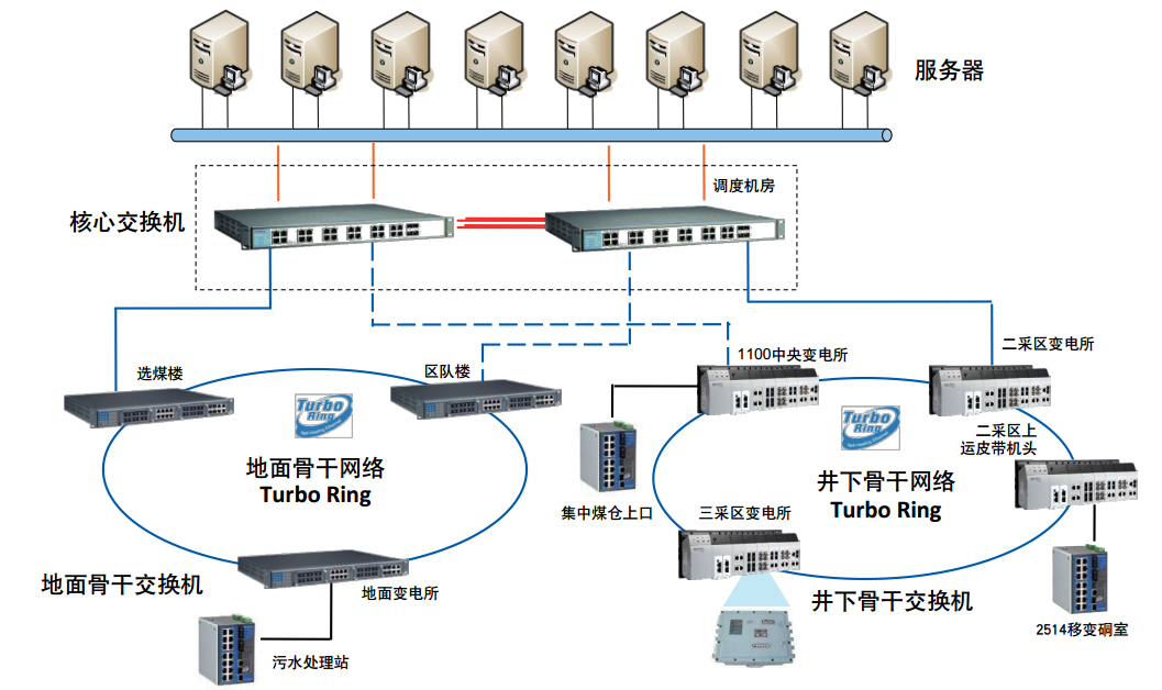 某煤礦自動化系統(tǒng)是由分布式SCADA系統(tǒng)和CCTV視頻監(jiān)控系統(tǒng)組成,位于井上控制中心和井下現(xiàn)場。Moxa提供了一個強大的工業(yè)級以太網(wǎng)解決方案,支持千兆網(wǎng)絡(luò)、快速冗余恢復(fù)、寬溫能力,并節(jié)省布線成本。具體架構(gòu)如下: