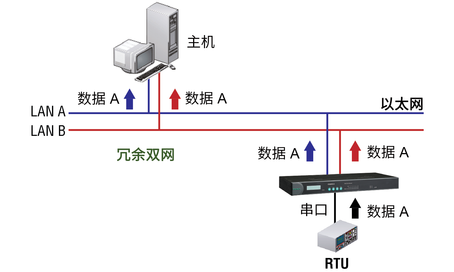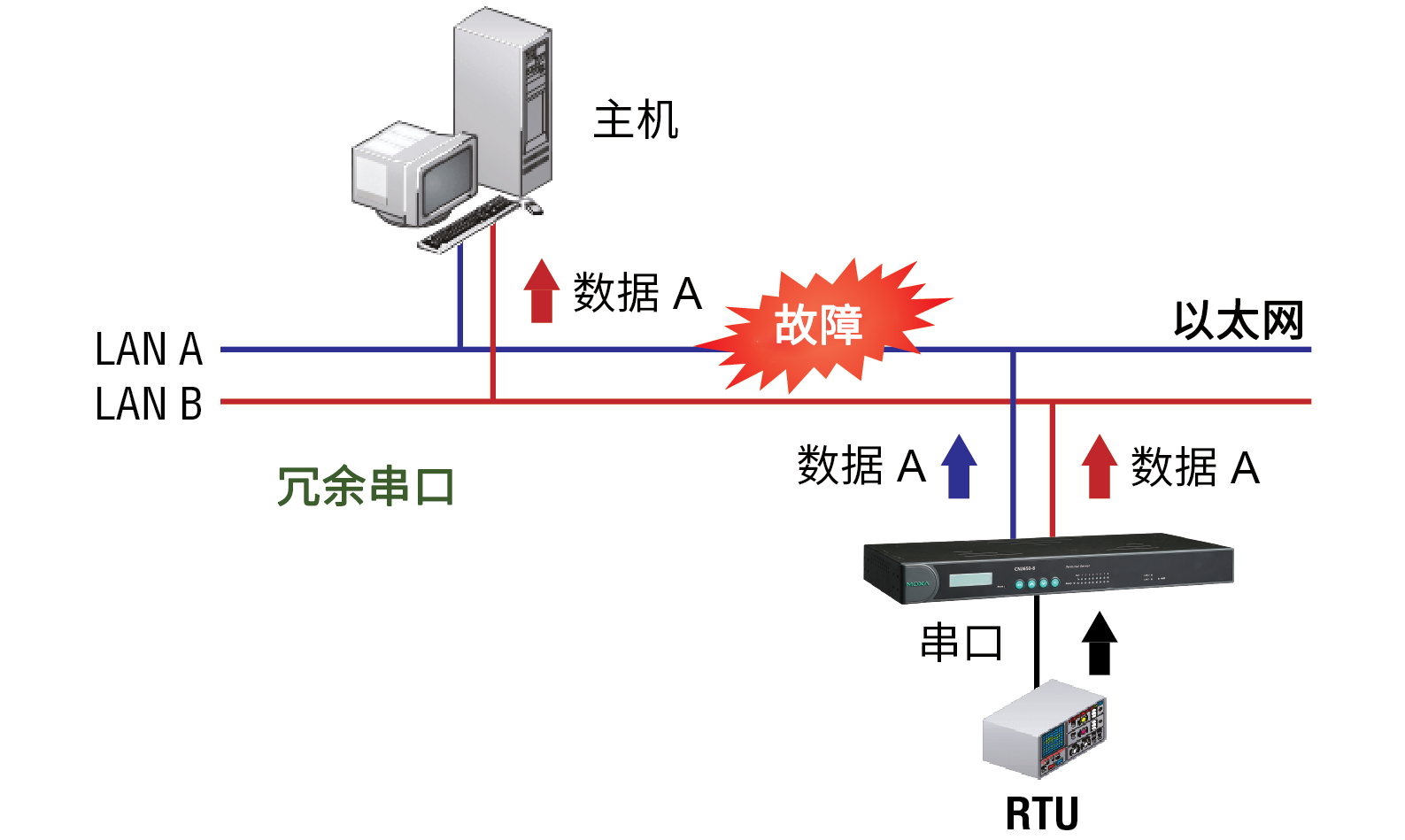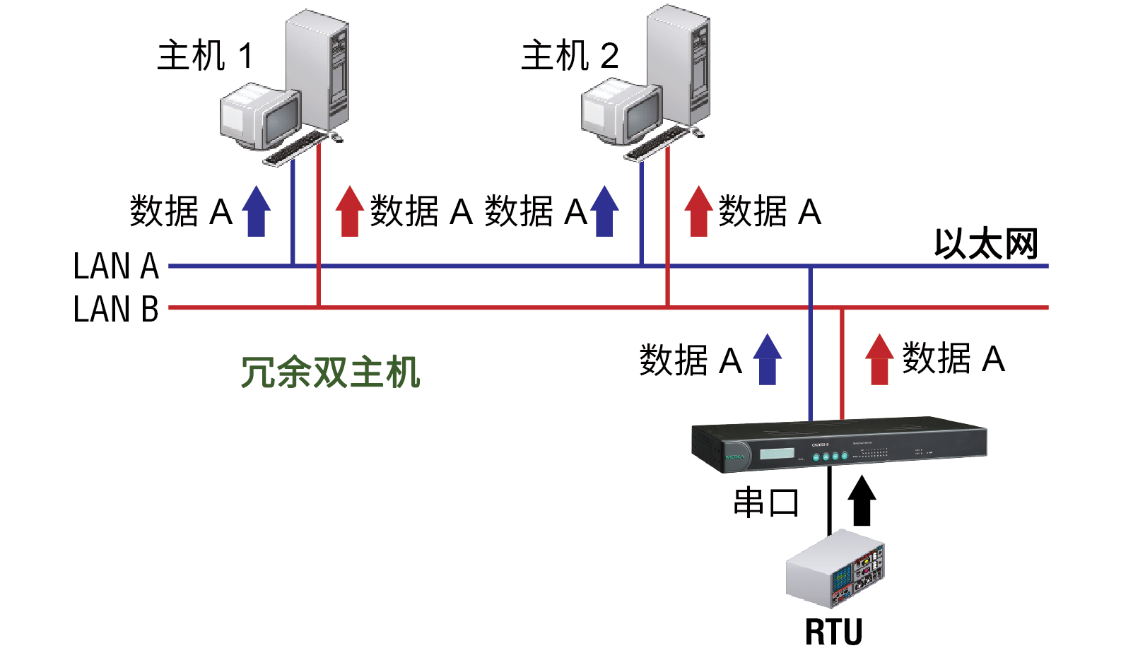 CN2600 的雙網(wǎng)口可設(shè)置為冗余“雙主機(jī)”模式。這種情況下,兩個(gè)網(wǎng)絡(luò)(圖中的 LAN A 和 LAN B)分別連接至不同主機(jī)。即使其中一臺(tái)主機(jī)意外宕機(jī),另一臺(tái)主機(jī)仍然可以繼續(xù)與 CN2600 連接的串口設(shè)備進(jìn)行通信。