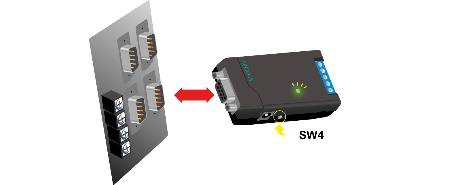 使用萬用表即可輕松檢測串口設備是否具備足夠電力供電給轉(zhuǎn)換器。TCC-80I 提供更簡單的檢測方式。只需將 TCC-80I 連接至設備的 RS-232 端口,并將 SW4 開關(guān)設置為檢測模式。如果專利設計的電源 LED指示燈亮起,顯示 TCC-80I 供電充足。如果 LED 燈不亮,則需要額外為 TCC-80I 配備外部電源。