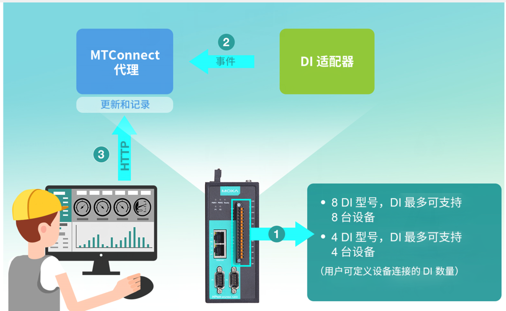 MTConnect 專為車間應(yīng)用而設(shè)計(jì),目的是將車間數(shù)據(jù)轉(zhuǎn)換為標(biāo)準(zhǔn)格式,使任何符合 MTConnect 的軟件應(yīng)用程序都可以理解。當(dāng)一個(gè)符合 MTConnect 要求的接口定義了數(shù)據(jù)(名稱、類型、描述等)之后,便無(wú)需在每個(gè)應(yīng)用中重新定義。對(duì)于不支持 MTConnect 的傳統(tǒng)機(jī)器,常見做法是通過傳感器連接和 I/O 獲得機(jī)器相關(guān)數(shù)據(jù)。Moxa NPort IA5000A-I/O 的 MTConnect 功能支持設(shè)備上所有數(shù)字輸入,并提供可配置的接口,用戶可用于定義需要關(guān)聯(lián)到的數(shù)字輸入數(shù)據(jù)和相應(yīng)的 MTConnect 標(biāo)簽。