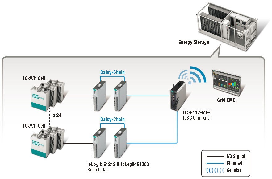 ioLogik E1242-T、ioLogik E1260-T和UC-8112-ME-T正適合此項(xiàng)目。ioLogik E1242-T的兩個(gè)DI通道用于監(jiān)控繼電器位置,兩個(gè)DO通道用于打開或關(guān)閉繼電器。ioLogik E1242-T的每個(gè)AI通道用于監(jiān)控串的當(dāng)前值(六節(jié)電池)。ioLogik E1260-T的六個(gè)RTD通道用于監(jiān)控六個(gè)電池的溫度。此外,ioLogik E1242-T和ioLogik E1260-T的緊湊和菊花鏈設(shè)計(jì)可嵌入電池系統(tǒng),無需添加額外的非管理型交換機(jī)。UC-8112-ME-T用于記錄ioLogik E1242-T和ioLogik E1260-T的歷史數(shù)據(jù)。經(jīng)過一段時(shí)間后,系統(tǒng)提供商可以從UC-8112-ME-T中檢索歷史數(shù)據(jù)并找出解決充電/放電的方法。