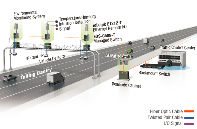 在整個(gè)國(guó)家公路系統(tǒng)的150多個(gè)門(mén)架上安裝了多個(gè)模塊化機(jī)柜。在每個(gè)機(jī)柜中,攝像機(jī)和車(chē)輛檢測(cè)設(shè)備連接到EDS-G509-T(或EDS-510A-3GT-T)工業(yè)以太網(wǎng)交換機(jī)。這些交換機(jī)具有高性能千兆帶寬,可將大量圖像和交易數(shù)據(jù)傳輸?shù)娇刂浦行摹K鼈冞€配置了IGMP監(jiān)聽(tīng),以?xún)?yōu)化帶寬使用并減少網(wǎng)絡(luò)擁塞。EDS-G509-T還配備5個(gè)光纖端口,為ITS網(wǎng)絡(luò)提供長(zhǎng)距離傳輸。