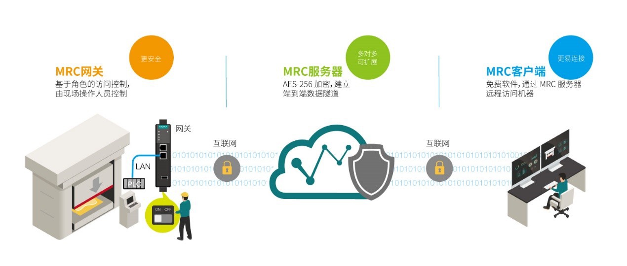 在眾多遠(yuǎn)程連接解決方案中,Moxa MRC 因多重優(yōu)勢(shì)脫穎而出,如全面的端到端安全性、便捷性、基于云的靈活性、不懼工廠惡劣條件考驗(yàn)的可靠性等。只需 MRC 網(wǎng)關(guān)、云服務(wù)器和客戶端軟件三個(gè)組件,即可建立基于云的遠(yuǎn)程訪問(wèn)連接。
